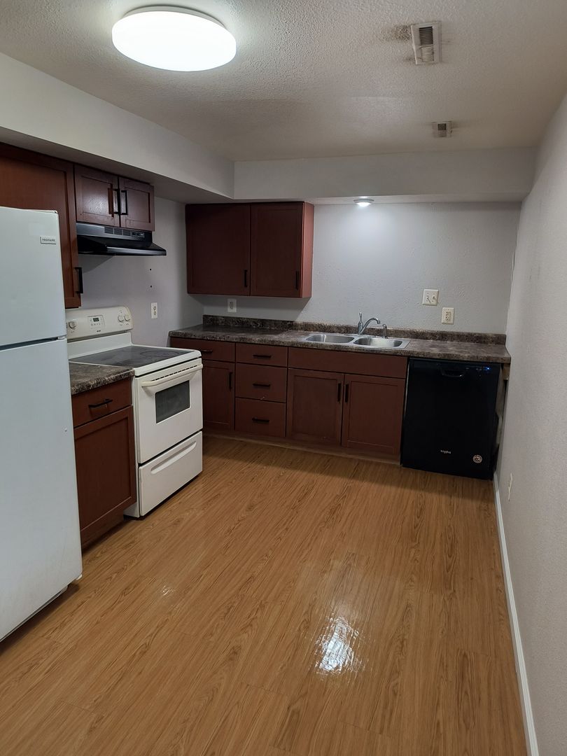 2 bedroom, 1 bathroom apartment. Stove/Fridge and dishwasher provided. This unit has washer/dryer hookups. We mow the lawn.