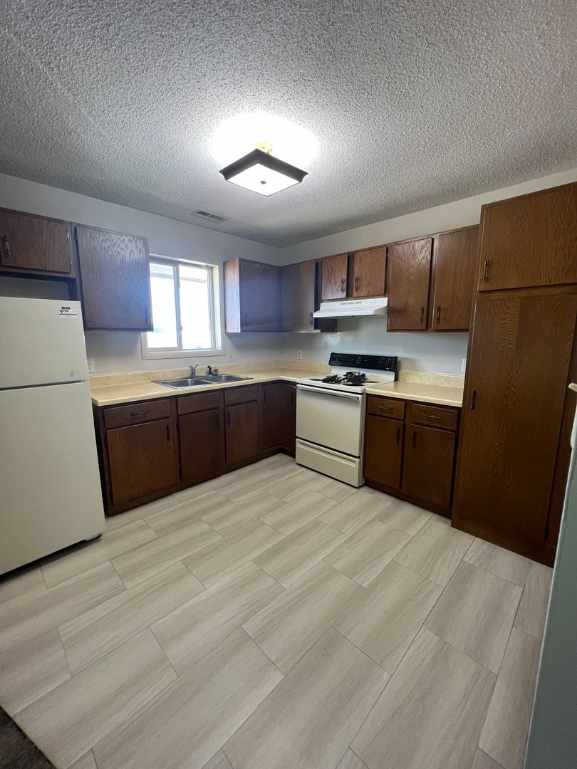 2 bedroom, 1 bathroom upstairs apartment with stove and fridge. We pay for water, trash and take care of the lawn. No laundry hookups in apartment but has onsite facility with coin operated machines.