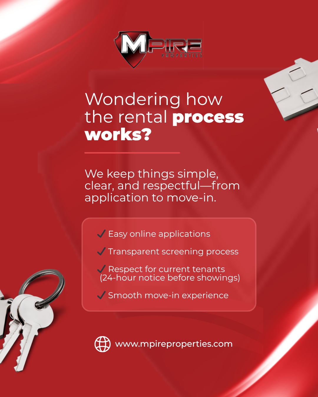 Searching for your next home can be exciting, but we know it can also feel stressful if you’re not sure what to expect. At MPIRE Properties, we aim to make the process as smooth, respectful, and transparent as possible for both current and future tenants.